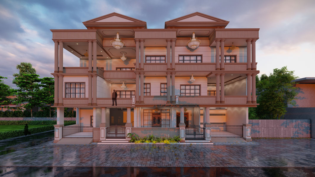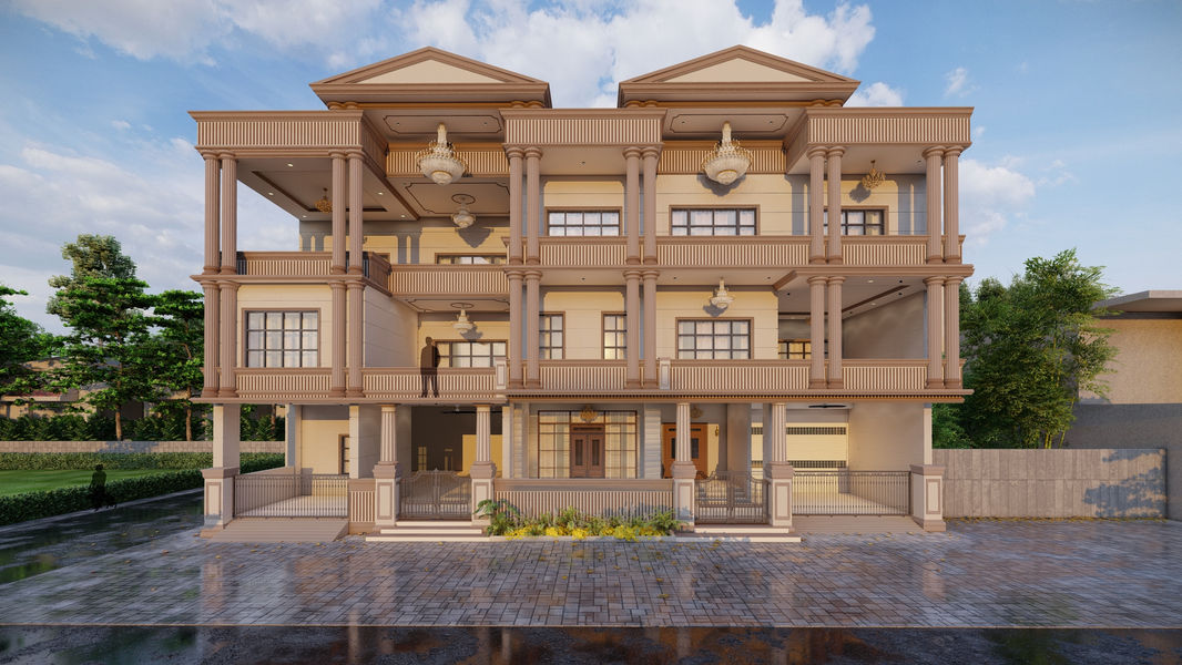 An ultra-luxurious mansion designed for a joint family of two brothers. It showcases remarkable symmetry and a sense of opulence. It's imposing facade marked by strong classical column and evenly spaced balconies, exudes a stately elegance.The design perfectly complements the luxurious lifestyle featuring six expansive bedrooms, a majestic drawing room, and a striking double-height family space illuminated by a skylight, with each room opening onto spacious balconies and open areas that flood the interiors with natural light and fresh air; the bungalow also boasts a beautifully landscaped rooftop gym and Jacuzzi, offering a serene retreat.